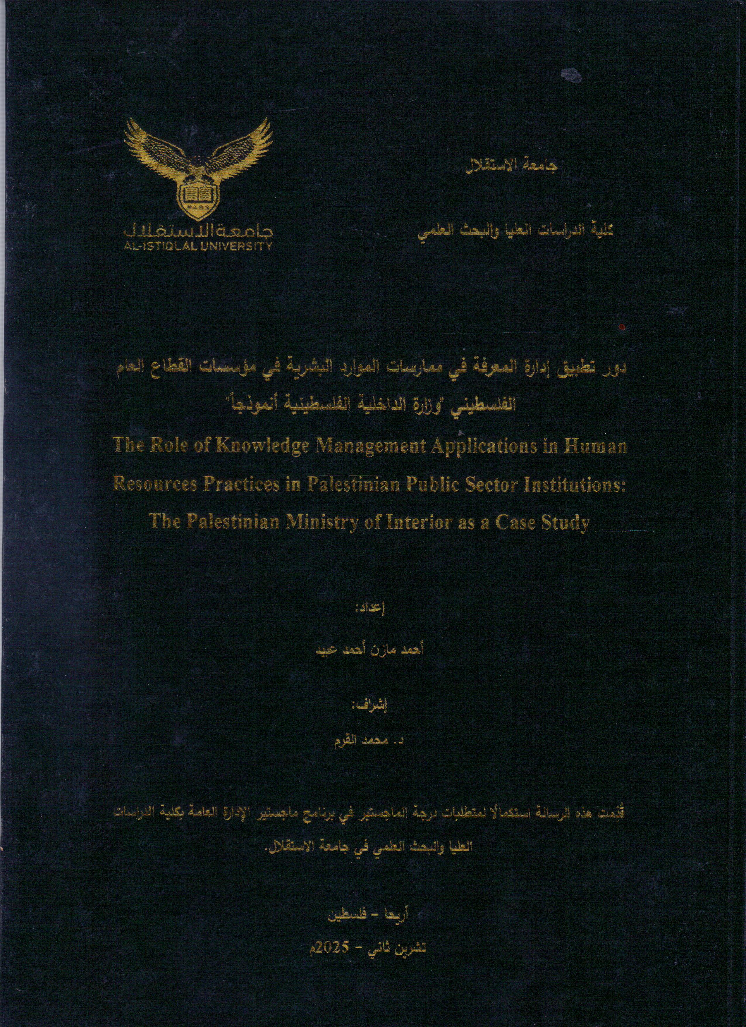دور تطبيق ادارة المعرفة في ممارسات الموارد البشرية في مؤسسات القطاع العام الفلسطيني: وزارة الداخلية أنموذجا. | ر / 351.007 / د و ر | 2025 |