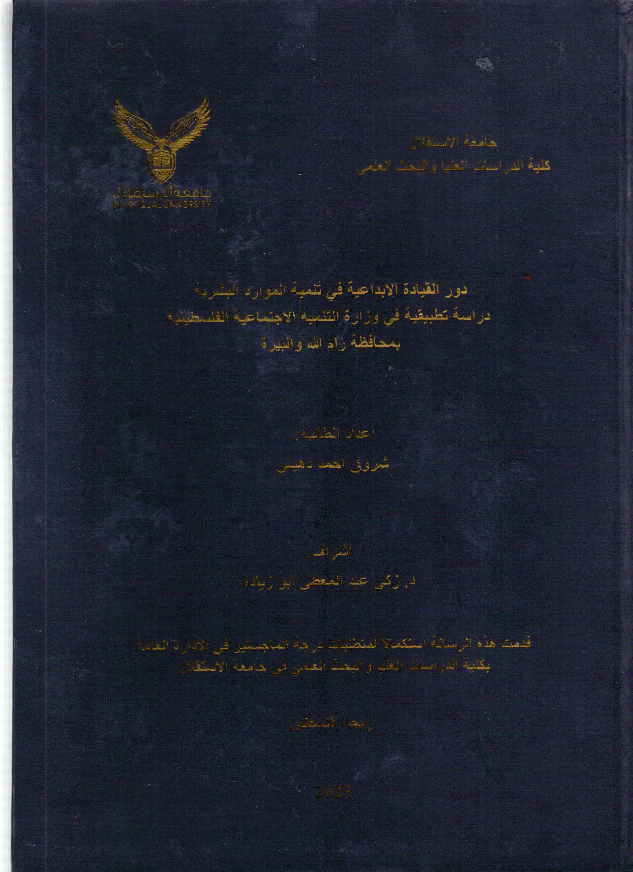 دور القيادة الابداعية في تنمية الموارد البشرية دراسة تطبيقية في وزارة التنمية الاجتماعية الفلسطينية بمحافظة رام الله والبيرة ر/351.0074/د و ر