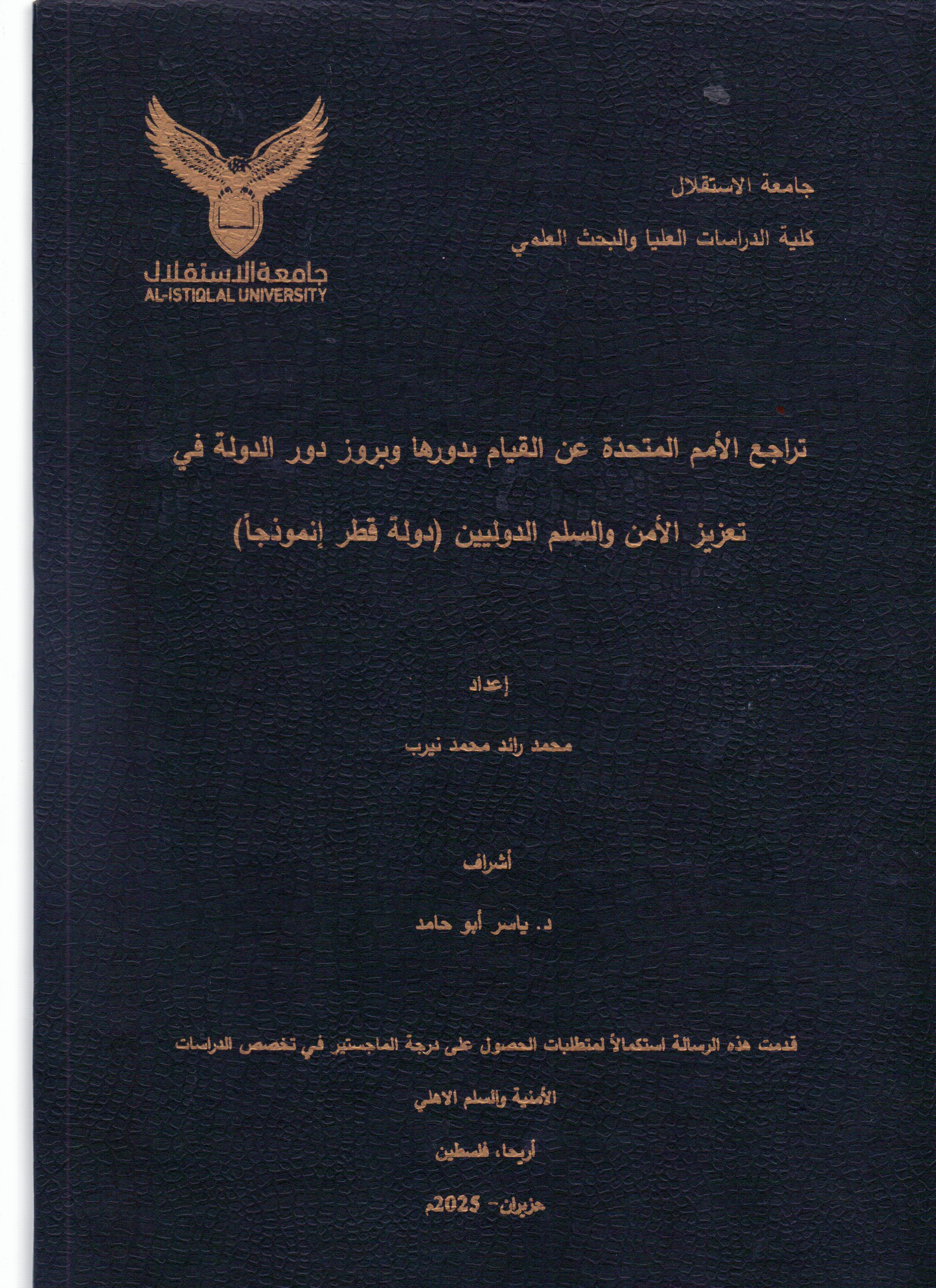 تراجع الامم المتحدة عن القيام بدورها وبروز دور الدولة في تعزيز الامن والسلم الدوليين(دولة قطر انموذجا) ر/341.23/ت ر ا