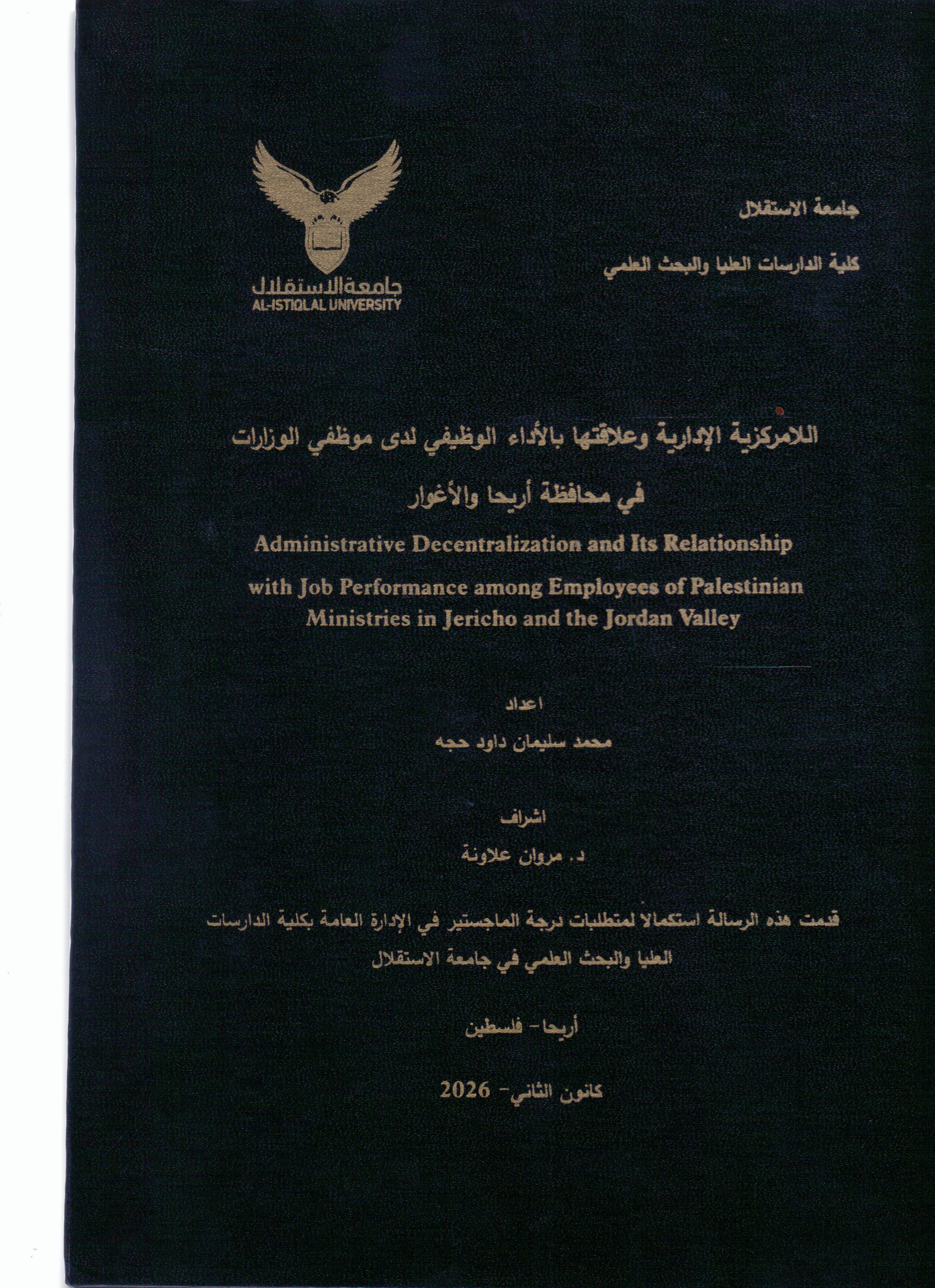 اللامركزية الادارية وعلاقتها بالاداء الوظيفي لدى موظفي الوزارات في محافظة اريحا والاغوار ر / 352 / ل ا م