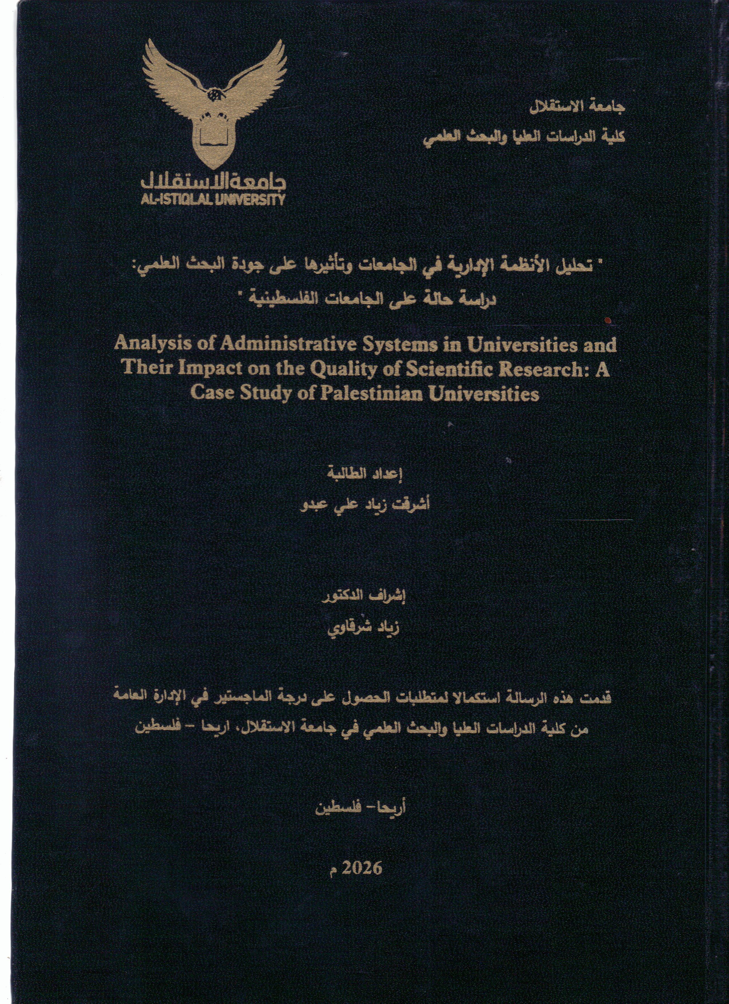 تحليل الانظمة الادارية في الجامعات وتاثيرها على جودة البحث العلمي: دراسة حالة على الجامعات الفلسطينية ر / 378.1 / ت ح ل