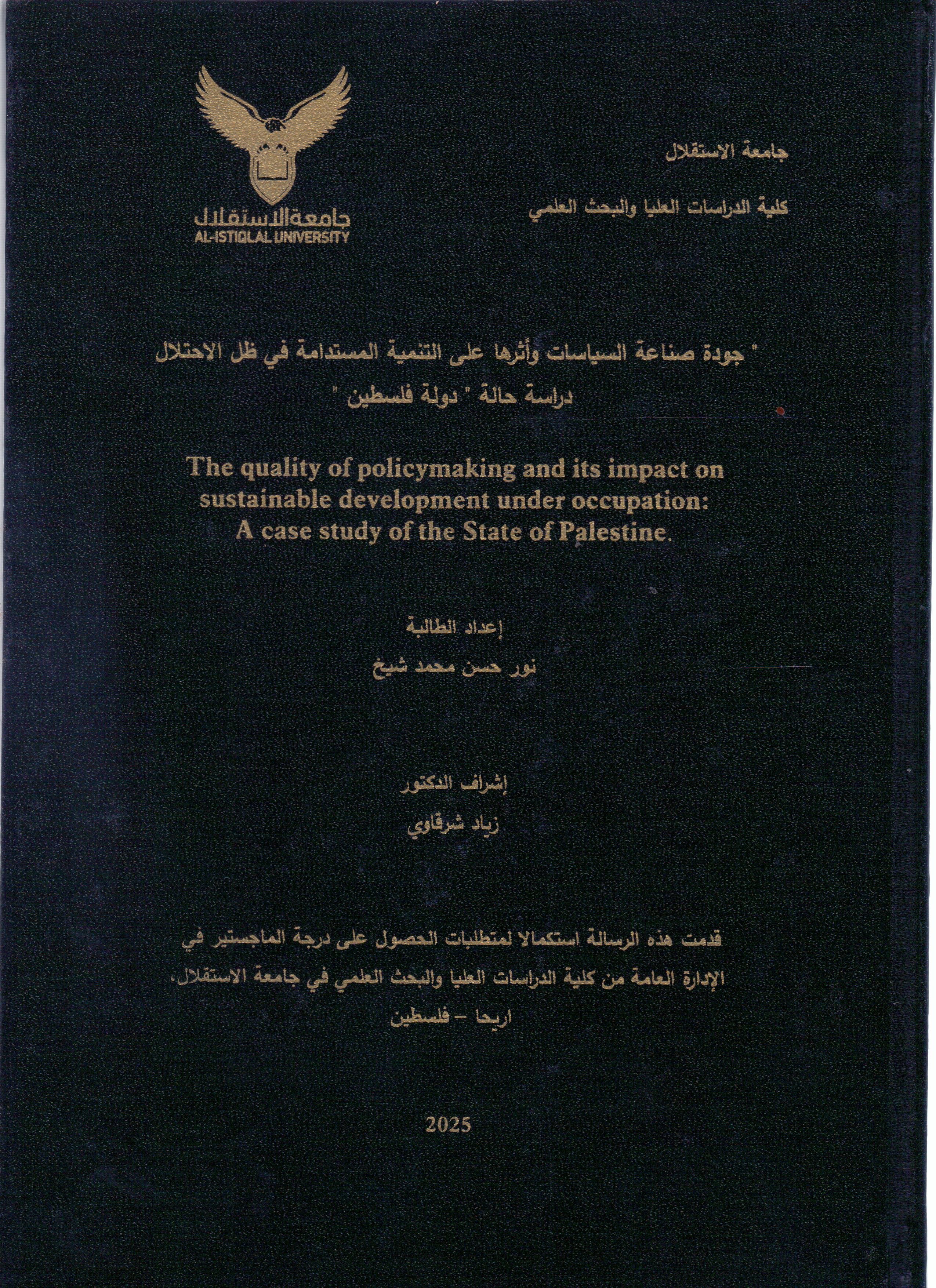 جودة صناعة السياسات واثرها على التنمية المستدامة في ظل الاحتلال: دراسة حال دولة فلسطين ر / 320.6 / ج و د
