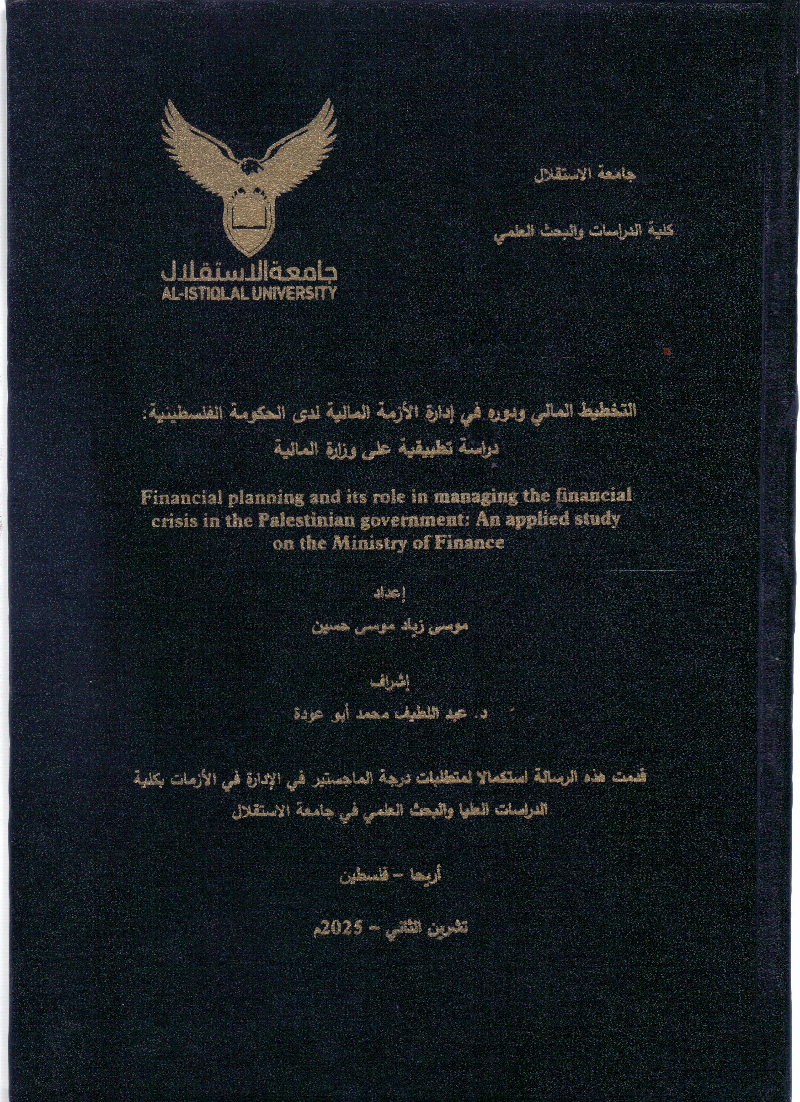 التخطيط المالي ودوره في ادارة الازمة المالية لدى الحكومة الفلسطينية: دراسة تطبيقية على وزارة المالية ر / 336.39 / ت خ ط