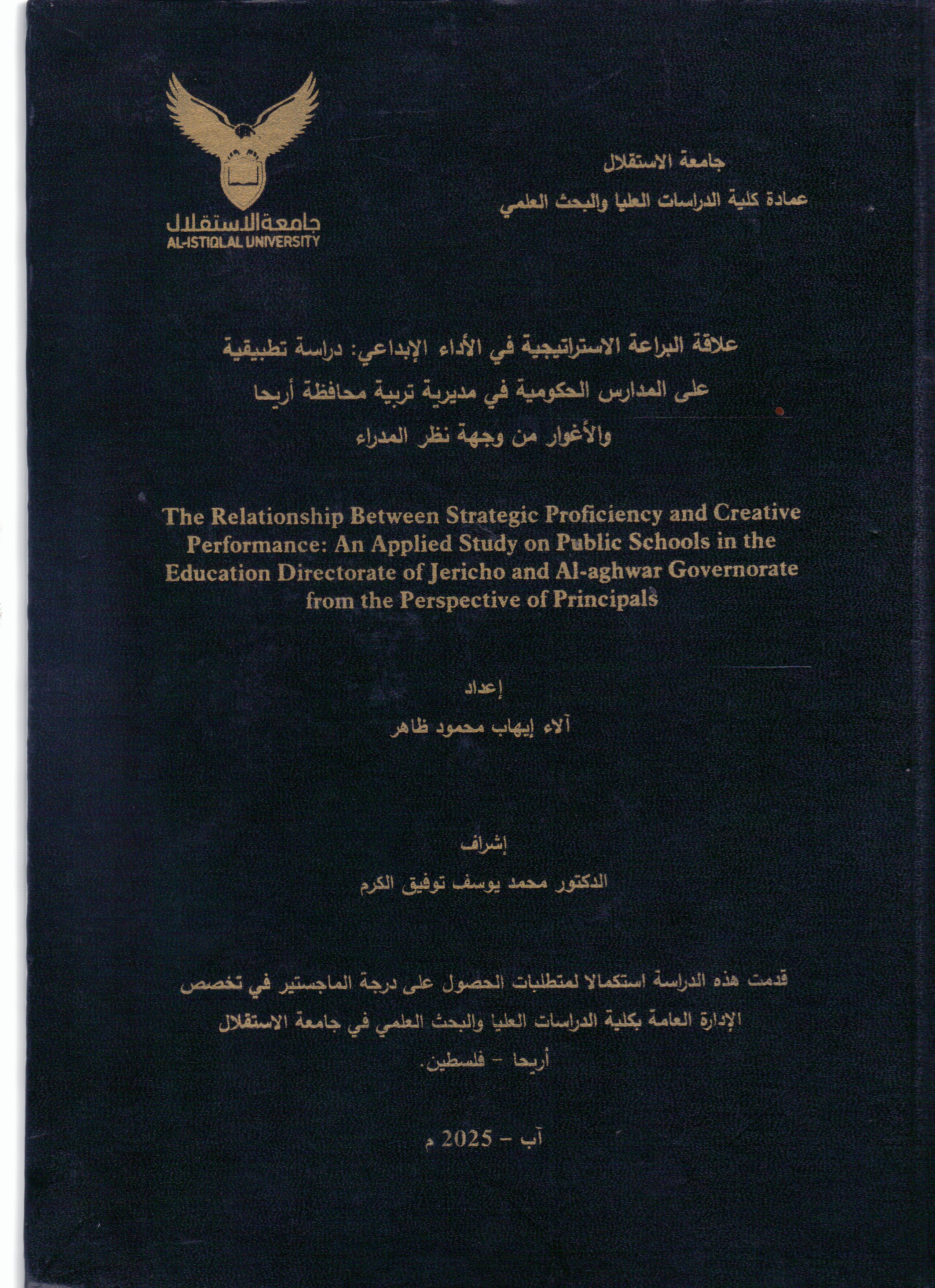 علاقة البراعة الاستراتيجية في الاداء الابداعي: دراسة تطبيقية على المدارس الحكومية في مديرية تربية محافظة اريحا والاغوار من وجهة نظر المدراء ر / 371.2 / ع ل ا