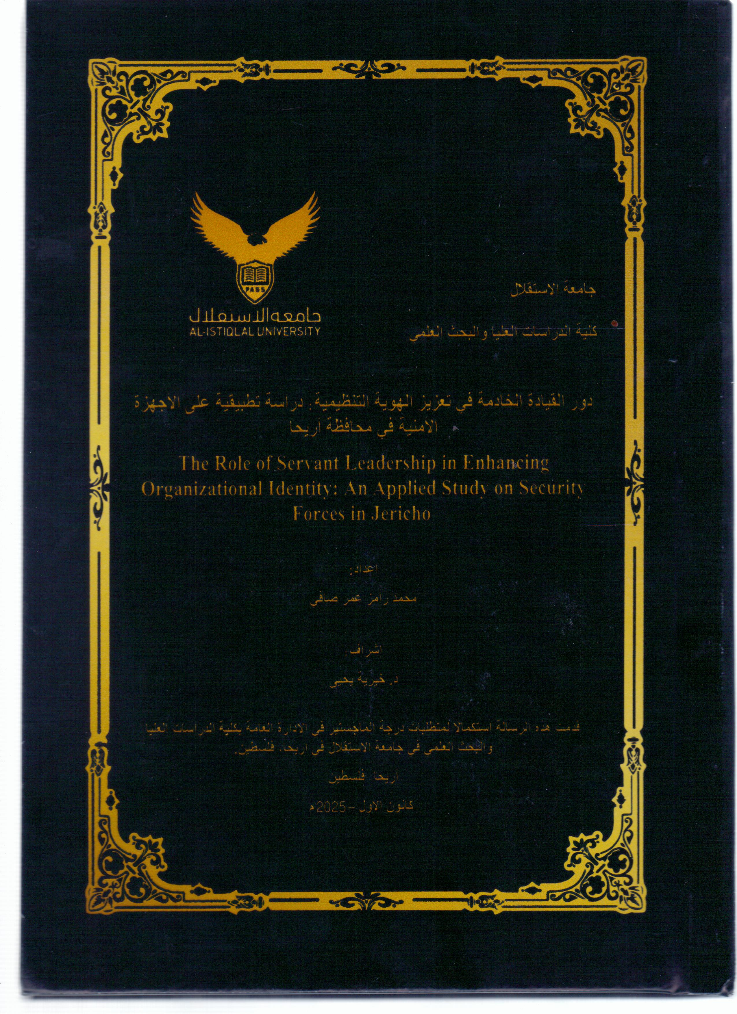 دور القيادة الخادمة في تعزيز الهوية التنظيمية: دراسة تطبيقية على الاجهزة الامنية في محافظة اريحا ر / 658.4 / د و ر