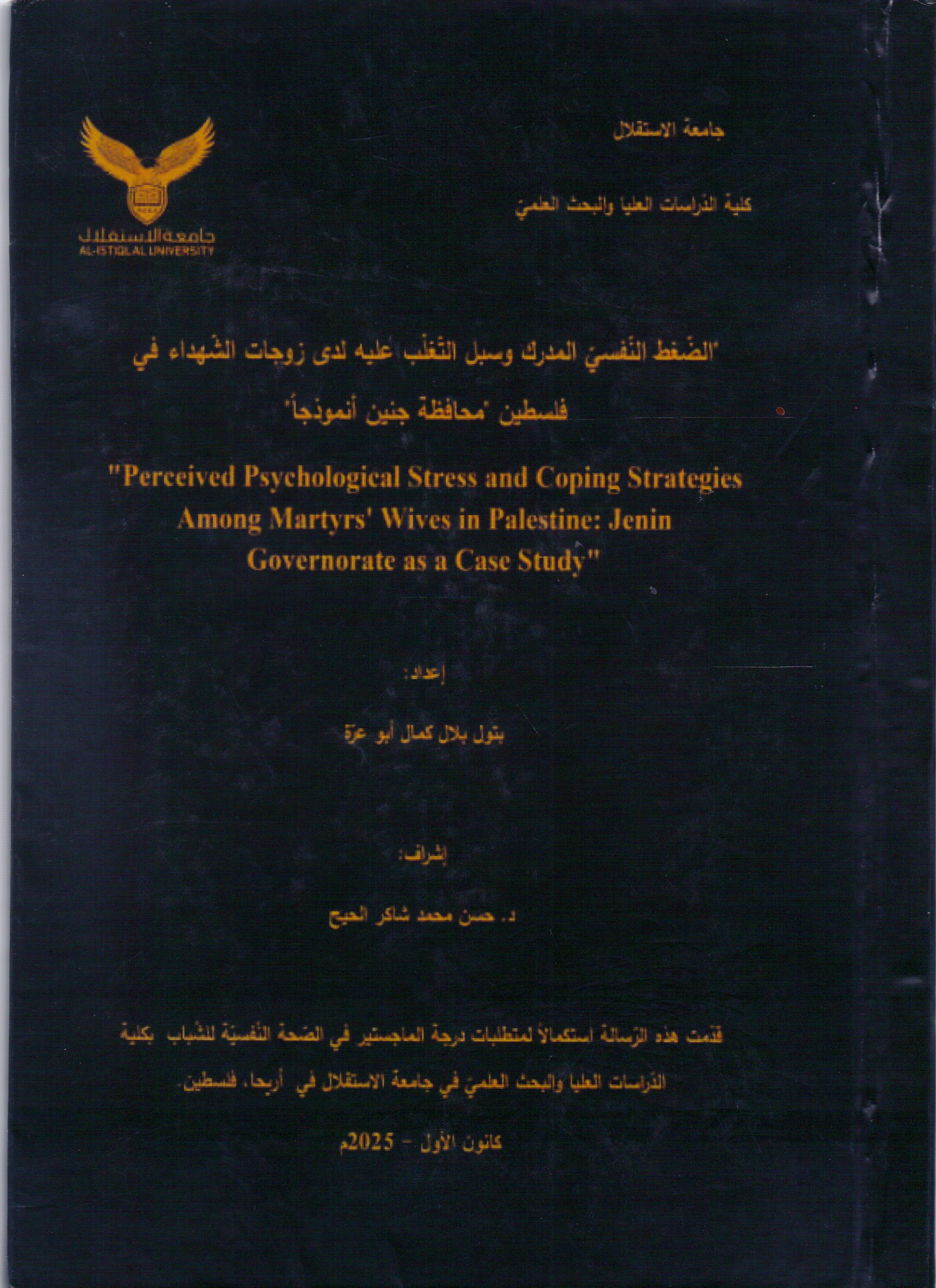 الضغط النفسي المدرك وسبل التغلب عليه لدى زوجات الشهداء في فلسطين: محافظة جنين انموذجا ر / 155.9 / ض غ ط