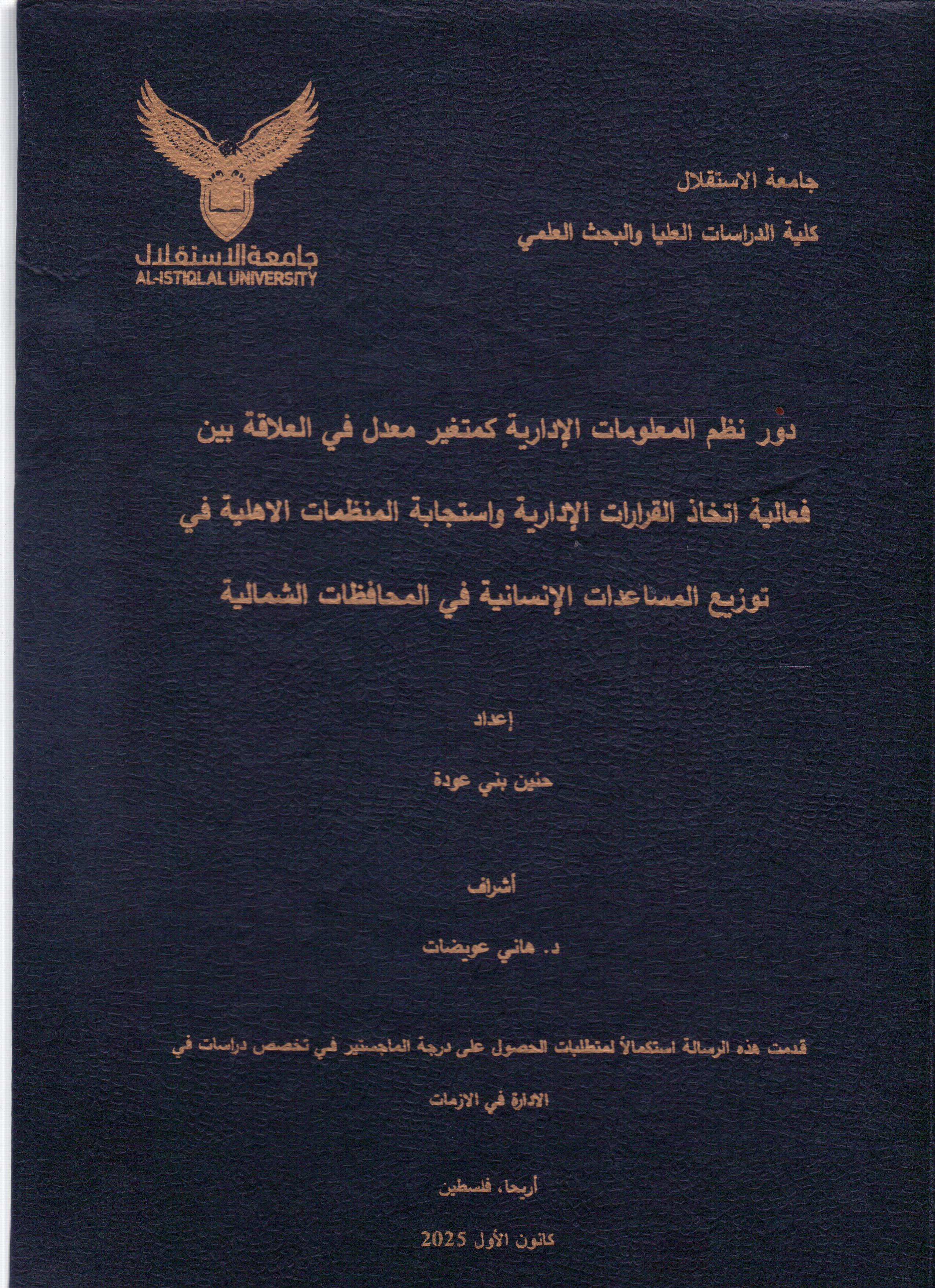 دور نظم المعلومات الادارية كمتغير معدل في العلاقة بين فعالية اتخاذ القرارات الادارية واستجابة المنظمات الاهلية في توزيع المساعدات الانسانية في المحافظات الشمالية ر / 658.403 / د و ر