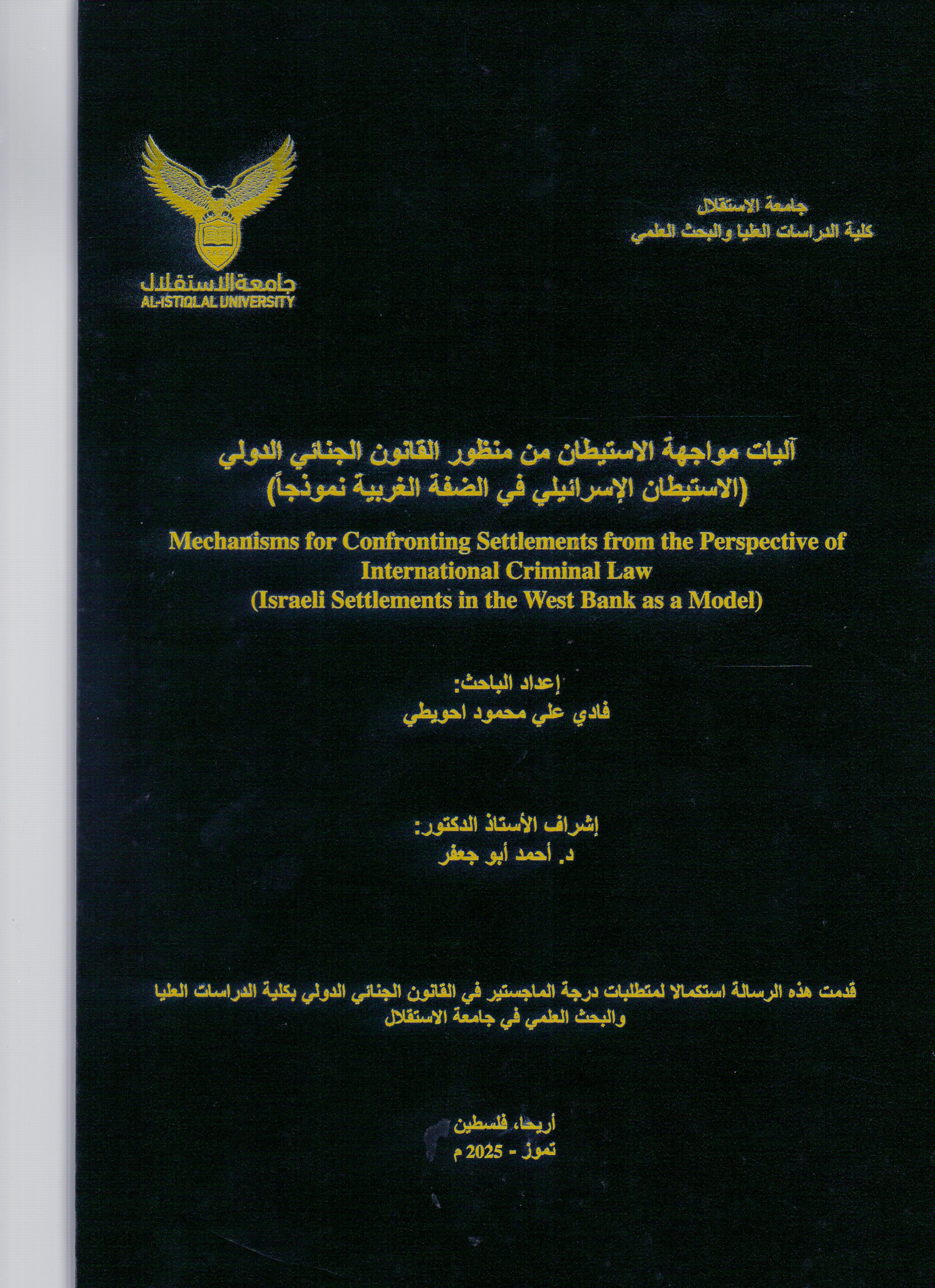آليت مواجهة الاستيطان من منظور القانون الجنائي الدولي (الاستيطان الاسرائيلي في الضفة الغربية نموذجا) ر / 341.77 / ا ا ل